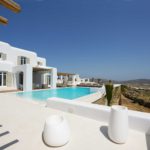 Inspired by the vernacular architecture, the whole structure is a cluster of efficiently arranged cubes painted stark-white to create a beautiful contrast with the colors of the sea and the sky. The interior is organized around an internal stone-paved courtyard that seems to be carved into the rock that surrounds it. Peppered with colorful flowers, this hidden oasis features a comfortable pergola-shaded dining and lounging area with built-in sofa and an open-sky jacuzzi. At the front of the courtyard, a small terrace offers unobstructed views of the Mykonian seascape and the famous windmills.